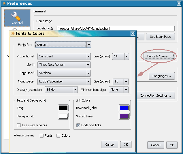 , and selected Verdana 14px for general browsing and LucidaTypewriter 11px for monospace text.
