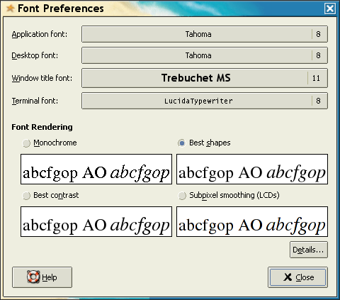 So we basically choosed Trebuchet 12pt as the window title font, the bitmap font LucidaTypewriter 8pt for fixed size text, and Tahoma 8pt for everything else, which includes menus, buttons, etc. The 2 first should follow your taste, but Tahoma 8pt for all the rest is the optimal configuration, also used by MS Windows 2000 and XP.