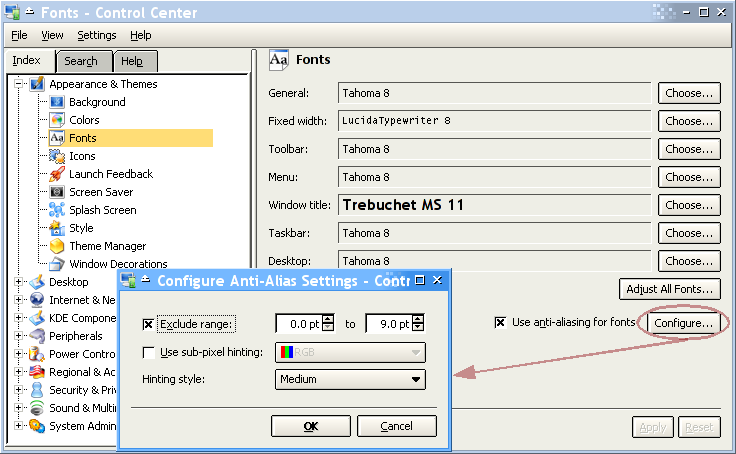 Here are some screen shots about the usage of these fonts on KDE. You should pay attention on how the widgets text on this window are rendered.