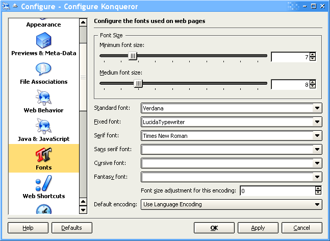 And this is finally for web browsing. We are using Verdana as the general font because it was simply designed for the purpose of fluent text reading on the screen. And the old LucidaTypewriter when a web page requested a fixed size font. Some may choose fonts like Courier or Bistream Vera Mono here.