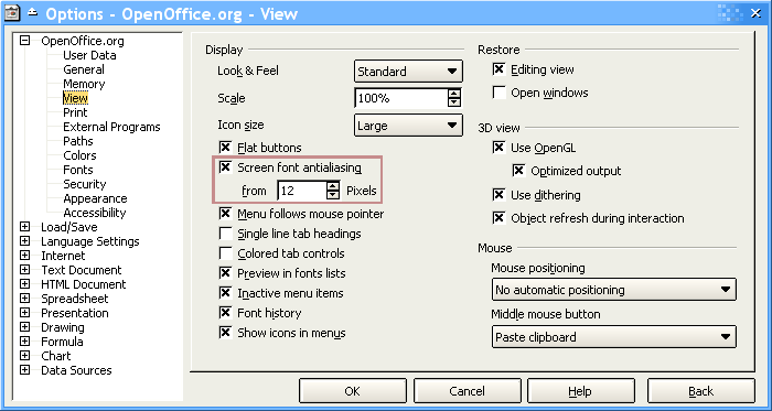 So we basically selected , menu, and in the View section we enable OOo to do anti-aliasing at font sizes beginning with 12 pixels (approximately 9pt), and the result is what you can see above: clean and comfortable widgets with Tahoma 8pt.