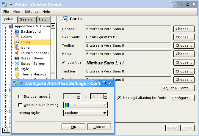 The main idea is to use good hinted fonts all around. As a general rule, we'll use Tahoma 8pt for desktop widgets, LucidaTypewriter 8pt for monospace text, and Verdana 8pt, 9pt or 10pt for fluent text reading or web surfing. These are the default font sizes on a Microsoft Windows desktop, and they look good on a 1024x768 screen. If you have a better screen resolution (1280x1024, 1600x1200) our suggestion is to stick with this fonts but increase their sizes.