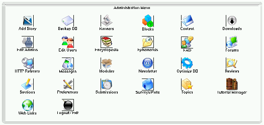 Once logged in, the administrator finds an interface that lists all the areas which can be acted upon (see Figure 4-1). If the administrator is a superadmin, he may work on all the areas of the site, if instead he is an administrator with limited powers he will see the links relative to the areas on which he is allowed to work. Through the preferences configuration we will be able to decide whether to display icons or just a textual interface. According to our choice either a textual or an icon administration interface will appear. Figure 4-1 shows the interface with the icons, as you can see.