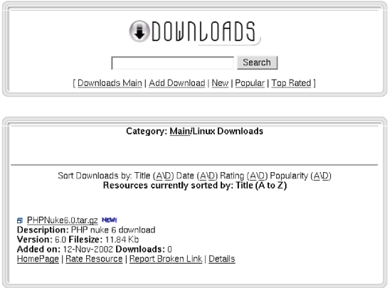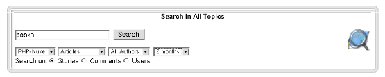 It is the main search engine for PHP-Nuke, it does full text searches on articles, comments, sections, users and book reviews (see Figure 3-5). It is possible to make multiple searches (e.g.. an article of a certain category written by a certain author).