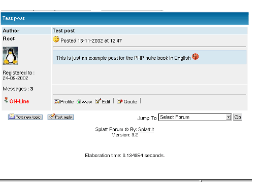 In version 5,6 - 6.0 of PHP-Nuke the Splatt forum is present. We still do not know if it will be integrated in successive versions to Nuke. I suggest to use it anyway, since it is a mature application and has an italian support comunity. The functionality implemented in this forum (on the user side) are many (see Figure 3-8), the forums are divided by category, have a dedicated inner search engine, users can associate to every post (participation in the forum) icons relating to the argument, cast a vote on a discussion, see various icons according to the degree of attention degree that a specific discussion has generated, see how many questions and answers a certain thread has received, see the profile of that user and many other functions...