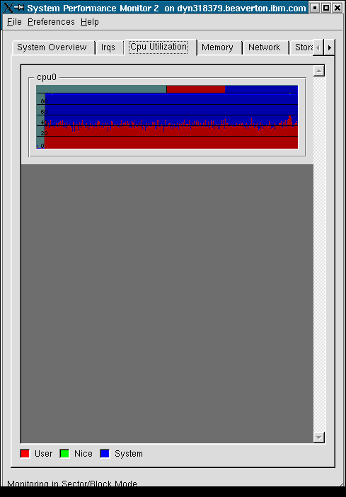 The histograms show information about user (red), system (blue), and nice priority (green) command utilization.