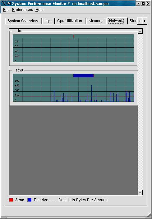 When you click the Network tab, histograms that show the amount of traffic on the system's loopback device and each network device are displayed, as shown in the following screenshot.