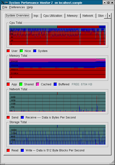 CPU total histogram, the red line represents user CPU usage, the green line represents commands run with a modified scheduling priority (nice), and the blue line represents system CPU usage.